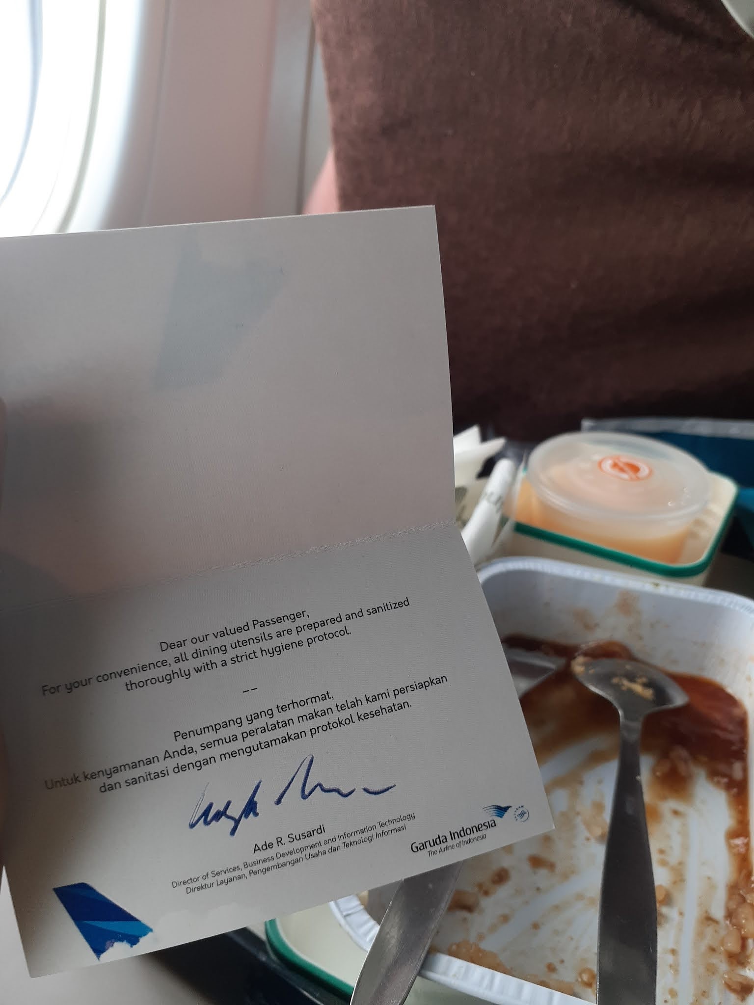 Waktu naik Garuda di Juli 2020, tak ada inflight meal, hanya saja penumpang dibagikan kotak snack. Alasannya untuk meminimalisir interaksi kru pesawat dengan penumpang.